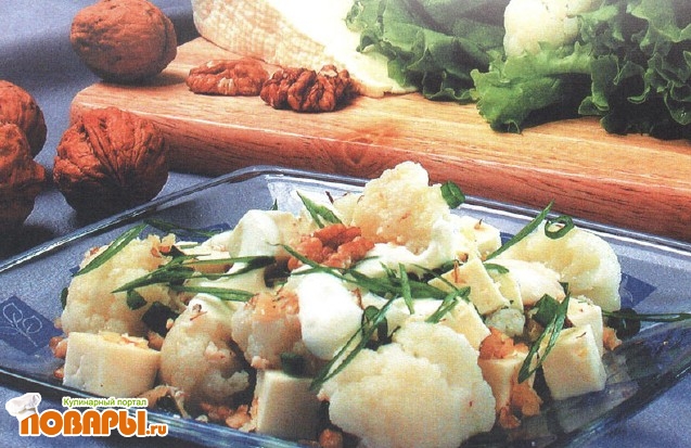 Капусту разбирают на соцветия, отваривают в подсоленной воде, охлаждают и мелко рубят, смешивают с грецкими орехами и зеленым луком.
