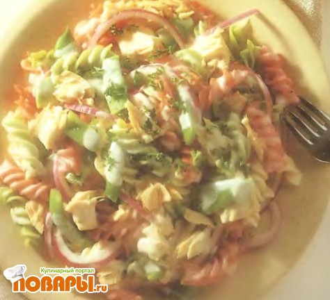 В этом салате найдено оригинальное сочетание тунца с зеленой фасолью, фузилли белого, красного и зеленого цвета с добавками из шпината и помидоров. Такой салат можно приготовить и из лосося. Трехцветная фузилли, зеленая фасоль и красный лук под чесночно-фасолевым соусом создают яркую палитру этого блюда.