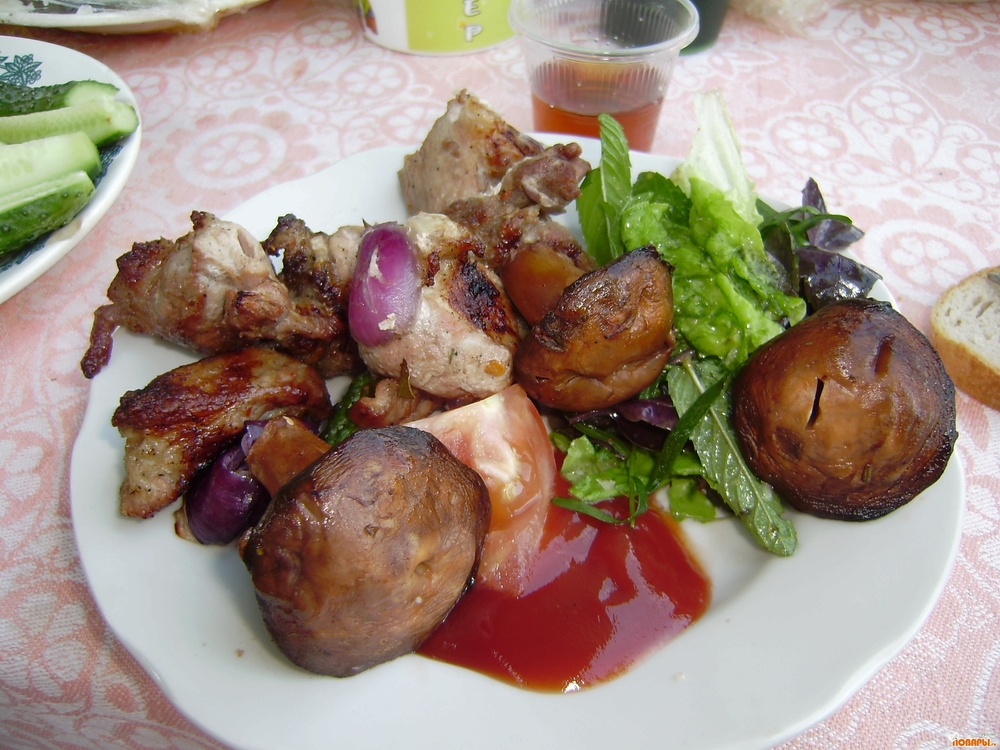 СОУС: чеснок натереть на мелкой терке или через чесночницу добавить пол чайной ложки соли и перетереть ложечкой или ступкой соль с чесноком, затем добавить мед, сок 1-го лимона и 100 гр. раст. масла все перемешать и залить салат непосредственно перед подачей шашлыка на стол.