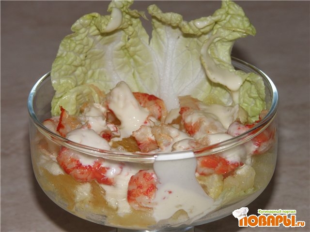 В каждый фужер положить по небольшому листику китайской капусты, на донышко 1/2 ч. л. майонеза, на майонез немного картошки. Затем положить кусочки апельсина и сверху раковые шейки.