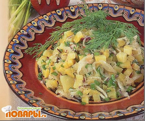 Соединить квашеную капусту и лук с картофелем, заправить растительным маслом, посыпать молотым перцем (или измельченным укропом) и перемешать. Дать пропитаться 20-30 минут.