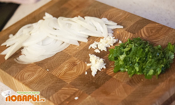 Лук и нарежем тонкими полукольцами, чеснок измельчим ножом или в ступке и порубим мелко кинзу.