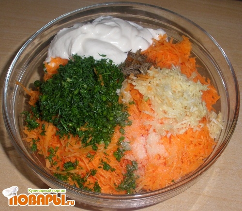 После соединить натертую морковь и чеснок с зеленью. Добавить к ним сметану или майонез, посолить, поперчить и тщательно перемешать.