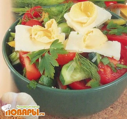 Выровнять верх салата и положить в центр кусочки свежей брынзы и охлажденного сливочного масла. Посыпать мелко нарезанной зеленью. Украсить кружочками свежего сладкого перца разных цветов.