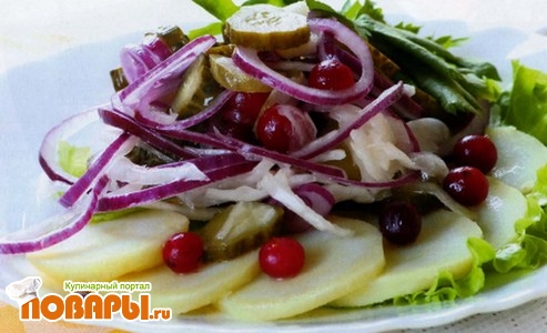 Уложить подготовленные продукты на блюдо, поперчить по вкусу. Заправить растительным маслом, украсить ягодами клюквы.