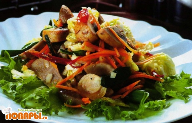 В конце жаренья добавить рубленый зеленый лук. Пекинскую капусту нарезать небольшими кубиками, добавить корейскую морковь, грибы, язык. Все перемешать, заправить по вкусу растительным маслом или майонезом.