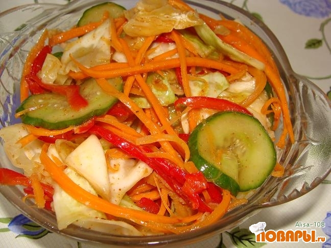 Укладываем плотно в банку, закрываем крышкой и отправляем салат в холодильник на пару часов. Периодически салат надо встряхивать, чтобы он хорошо промариновался.