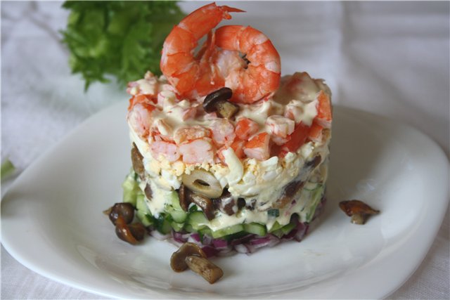 Лук, огурцы, грибы, оливки, яйца, креветки.