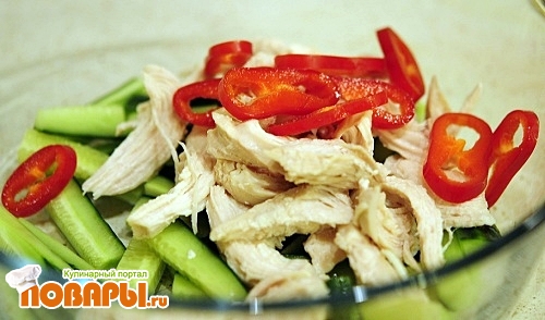 Как только все ингредиенты будут подготовлены можно начинать основной процесс приготовления салата. Для этого огурцы, филе, перец выложить в отдельную посуду.
