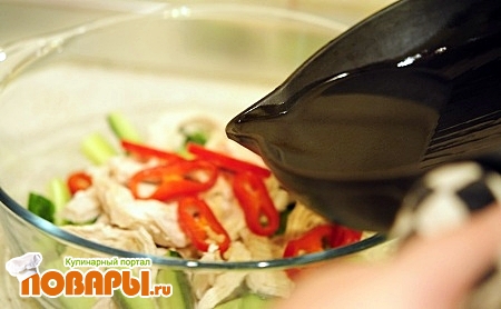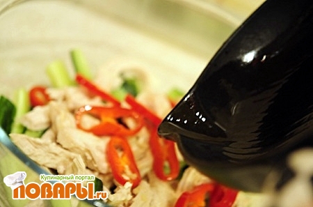 Раскалить сковородку и налить в нее подсолнечное масло, дать маслу хорошо разогреться. И выливаем раскаленное масло в наш салат, не отходя «далеко» заливаем в сковороду соевый соус, для салата нам понадобится 1/5 стакана, но соус должен быть не концентратом.