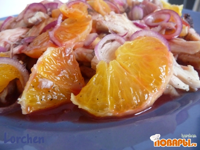 Соединить куриное мясо, апельсины и лук, посолить, поперчить, перемешать. Заправить соусом.
