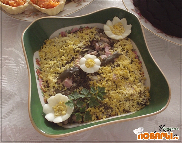 Салат выложить на блюдо и украсить желтком, натертым на мелкой терке, и цветами из белка.
