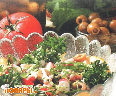 Продукты соединяют, заправляют майонезом, оформляют оливками, зеленью и лимоном.