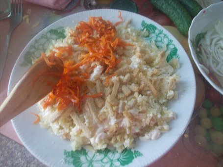 Морковь порежьте тонкой соломкой и обжарьте на масле, выложите на сухари, немного полейте майонезом.