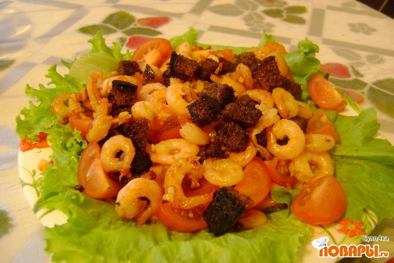 На листья салата выложить дольки помидоров, креветки, сухарики. Сбрызнуть соком лимона. Соль, перец по вкусу.