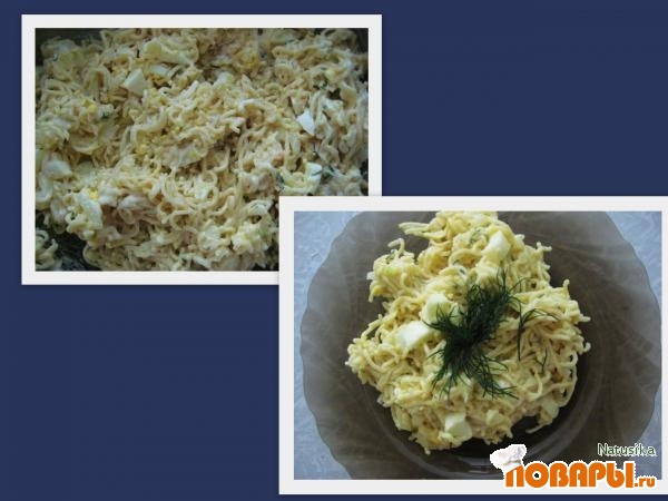 Для приготовления данного салата следует вскрыть пакетики с лапшой и приготовить её следуя рецепту написанному на самом пакете: достать лапшу, залить кипятком её на три минуты, слить излишки воды. засыпать в лапшу специи. Яйца отварить в крутую, очистить от скорлупы и нарезать кубиками.