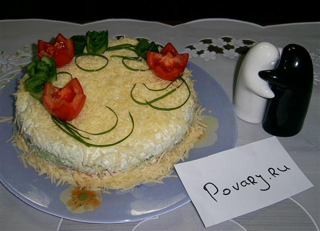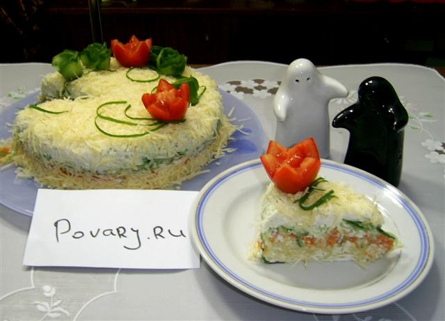 Вынуть форму из холодильника, перевернуть на блюдо, снять с салата пленку.