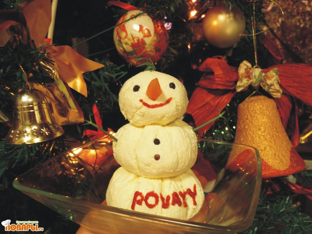 Оставшийся сыр разделить на 2/3 и 1/3. Из каждой части сформировать шарики средней и маленькой величины. Не снимая пленки поместить их на холод на 30 минут. Из морковки вырезать носик, перец горошком для глаз и пуговиц, веточки зелени для рук, томатный соус для улыбки.