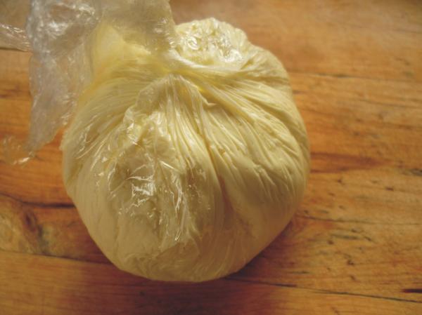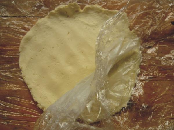 Сыр разделить на 2 части. Половину положить на пищевую пленку, накрыть вторым листом пленки и раскатать скалкой в пласт толщиной около 0.7 см, снять верхню пленку.