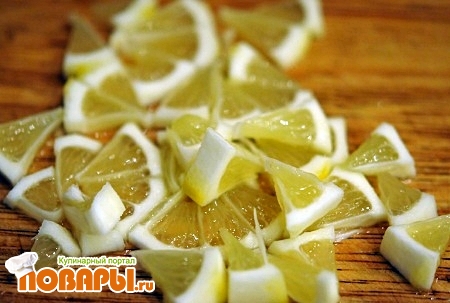 Лимон следует отчистить от кожуры, порезать сперва кружочками и затем на делениях- на дольки как пиццу.