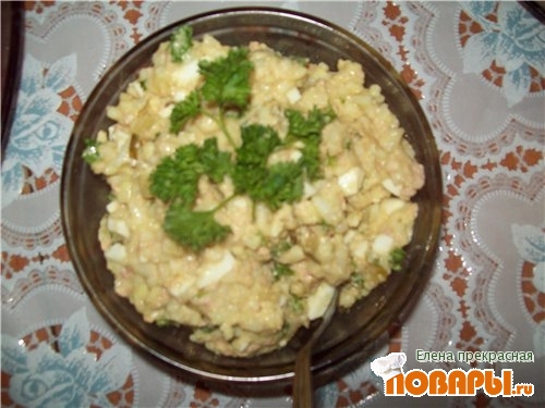 С печень слить жидкость и залить 1 стол.лож. сока лимона,размять вилкой и смешать со всеми ингредиентами, заправить растит.маслом(оливковым).
