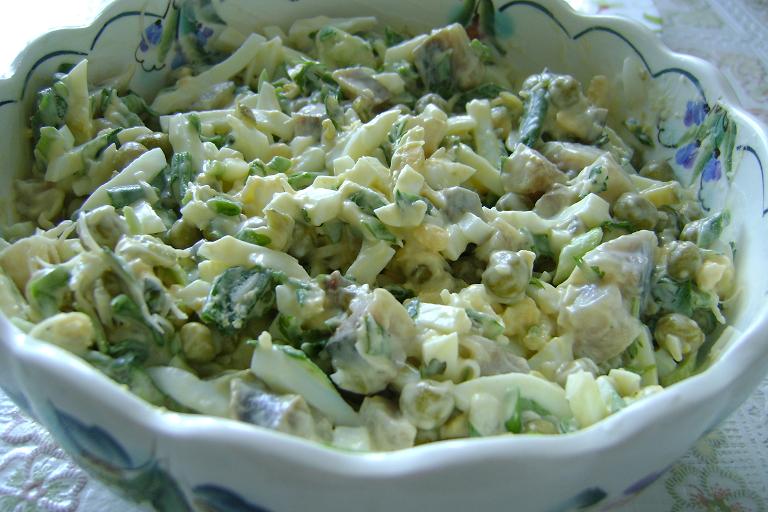 Филе сельди порезать на небольшие квадратики, огурцы и яйца соломкой. Добавить горошек, натертый на мелкой терке сыр, зелень. Все перемешать и заправить майонезом.