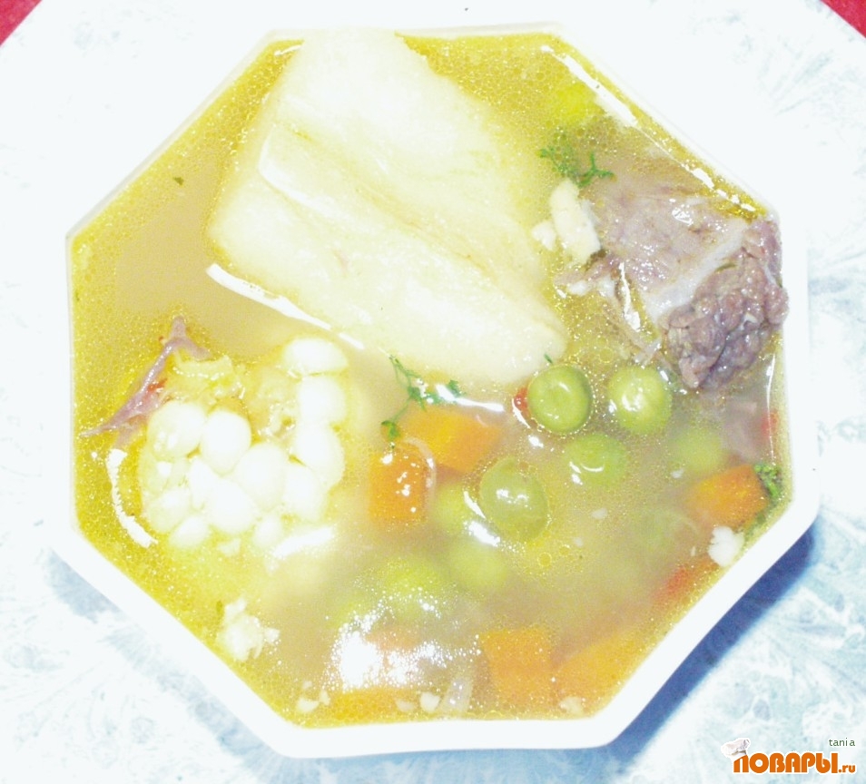 На этом бульене варить суп - сначала положить кукурузу, поварить минут 20, а потом добавить картошку, свежий горошек (если консервированный, то под конец варки), посолить, поперчить. Варить до готовности картошки. Под конец добавить зелень кинзы.