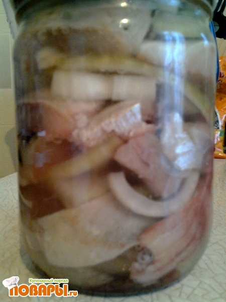 Маринад довести до кипения, добавить уксус и после полного остывания залить им сельдь.