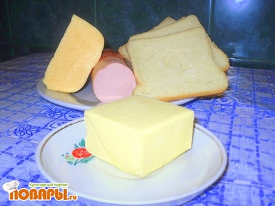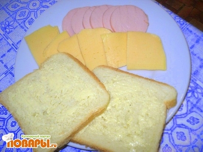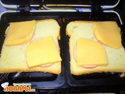 Для того что бы приготовить сэндвичи вам понадобится сэндвичница. Разогрейте сендвичницу до предела и положите ломтики хлеба маслом на метал, сверху положите на каждый кусочек хлеба по 1 кусочку колбаски и сыра пирамидкой.