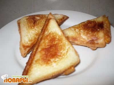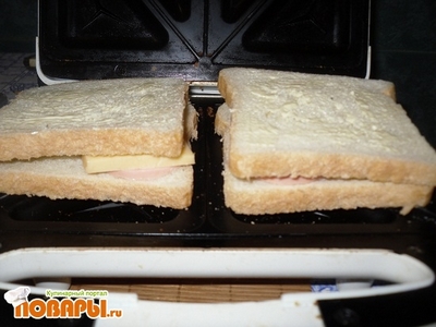 Сверху накройтй еще одним ломтиком хлеба, смазанной маслом стороной на верх и закройте сэндвичницу для запекания сэндвича на 3 минуты.