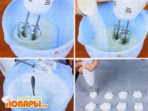 Печем безе (или можно купить готовые меренги): 3-4 охлажденных белка и 1,25 стакана сахара взбиваем миксером, постепенно добавляя порциями сахар. Когда в этой массе стоит ложка - белки готовы. На промасленной кальке выпекаем безе: ставим в хорошо разогретую духовку, а после того, как безе поднимется, убавляем жар до 100~120 градусов и сушим. Когда безе остынет снимаем с кальки.