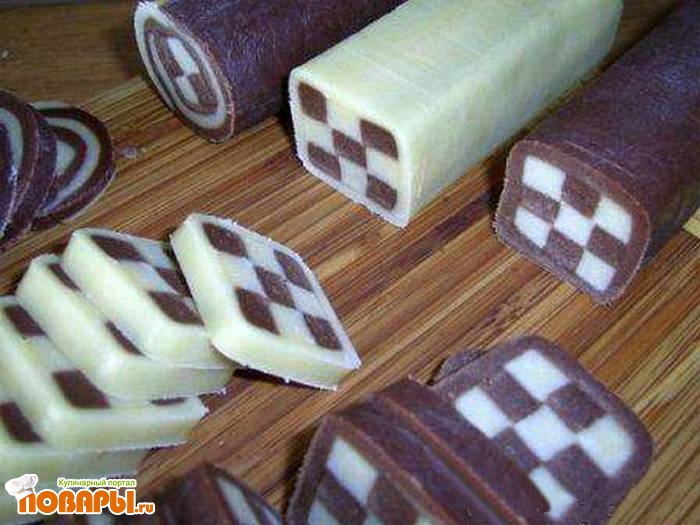 Перед раскаткой разделить ещё раз каждую часть пополам. Одну из них оставить на столе, а вторую отложить в холодильник. Раскатать белое тесто в прямоугольник, толщиной 1 см и нарезать брусочками такой же ширины - 1 см. То же самое сделать и с шоколадным тестом. Затем, смазав бока, взбитым и смешанным с молоком, желтком, сладываем брусочки в шахматном порядке (в 3 ряда и 3 "этажа").