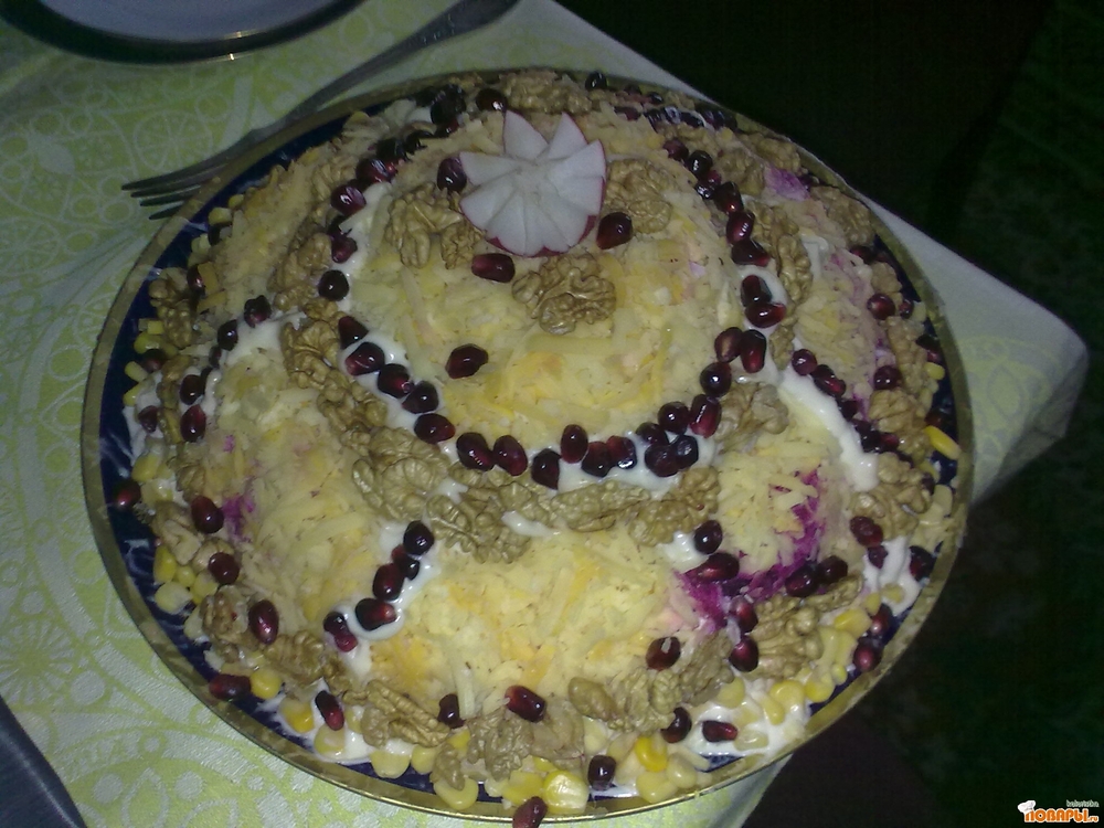 Прочитала рецепт в инете-с отварной курицей,сделала-красиво,но очень пресно.решила взять копчёную курицу и добавить в свёклу .сыр и майонез чеснок.Мне кажется,можно сделать и слой маринованных огурцов-но попробую в след.раз. Куриное филе порезать кубиком,орех измельчить.