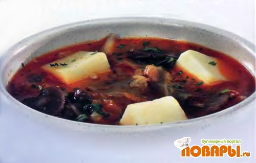 Томат обжарьте на масле с нарезанным кубиками луком и мукой при помешивании, остудите и разведите холодным грибным отваром. Добавьте нашинкованные и обжаренные на масле грибы и варите еще 10 минут. Заправьте солью, лавровым листом.