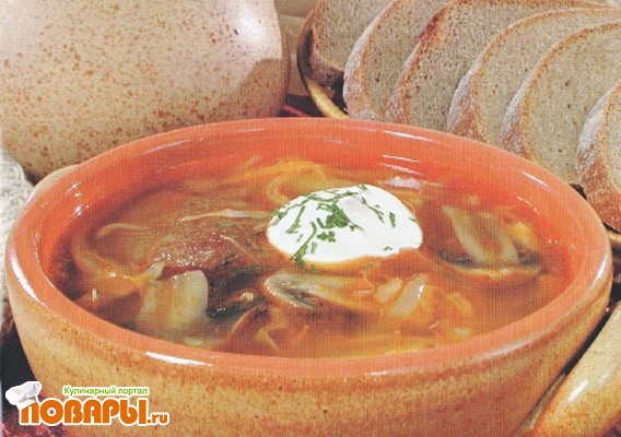 Картофель нарежьте брусочками. Чеснок разотрите с солью. В кипящий бульон положите картофель, доведите до кипения, варите 10 минут, добавьте овощи, соль, перец, доведите до кипения. В горшочки разложите грибы, мясо, чеснок, залейте щами, поставьте в духовку на 20 минут.