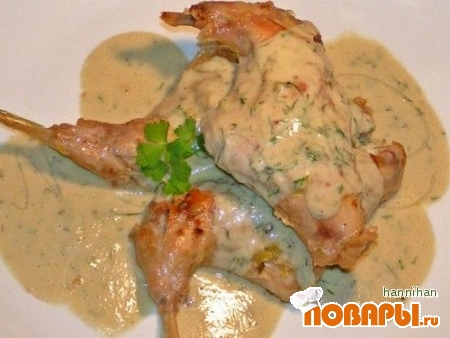 На хорошо разогретом растительном масле обжариваем мясо кролика до золотисто-румянного цвета (не обязательно до готовности). Когда получили желаемый цвет ставим на маленький огонь и добавляем 2 ст. л. соевого соуса и через минутку вино, опрыскиваем соком лимона 0,5 и добавляем лимонной цедры 0,5 - 0,7, перец чили из маринада, заливаем 200 гр. сливок и добавляем сыр "Филадельфия". Уже через несколько минут можно будет выкладывать блюдо.