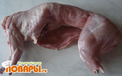 Тушку кролика желательно не замороженного разделываем на средние кусочки и маринуем.