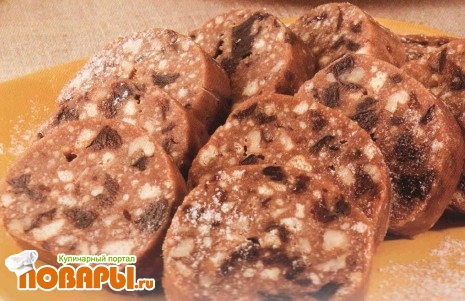 Смесь слегка охладите, смешайте с печеньем, наломанным небольшими кусочками, и орехами.