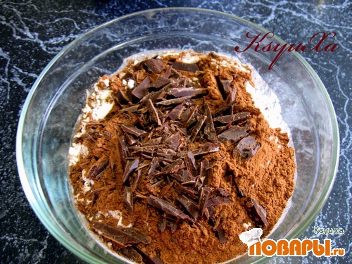 В отдельной ёмкости смешиваем сухие компоненты: просеянную муку, крахмал, какао, порошок для выпечки и шоколадную стружку (шоколад натирается на крупной тёрке или нарезается ножом).
