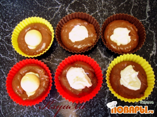 Выкладываем тесто в формочки на 2/3 объёма и выпекаем при t -170-180 градусов 20 минут.Я выкладывала 1 ложку теста, сверху 1 ч.л сливочного сыра,и на него 1 ч.л варёной сгущёнки,сверху ещё ложку теста.