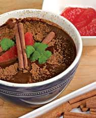 Грейпфрут очистить от кожуры и пленок, вырезать мякоть, посыпать ее порошком какао, корицей и оставшимся сахаром. Суп налить в тарелку, сверху положить ломтики грейпфрута и точас же подавать.