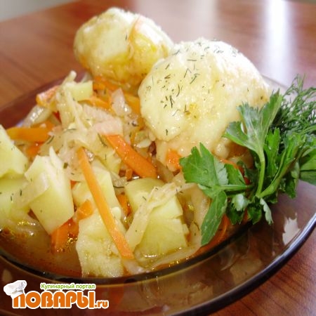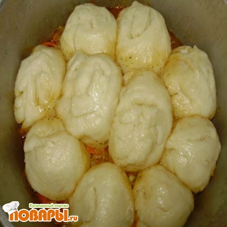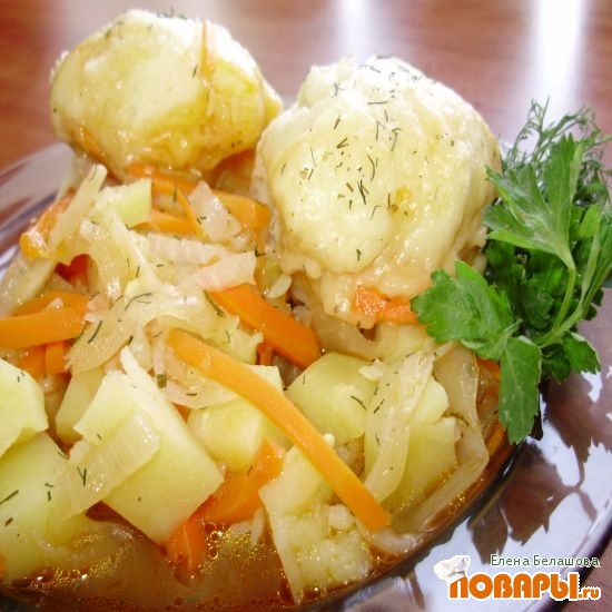 На тарелку выкладываем «шарики» (пампушки) теста и овощное рагу. Украшаем блюдо. На порцию 2-3 пампушки.