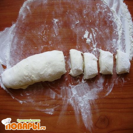 Тесто раскатываем или стряпаем. Обязательно сверху смазываем маслом растительным, сворачиваем рулетом, нарезаем на небольшие кусочки.