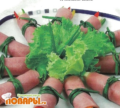 Перевяжите пером зеленого лука и оформите листьями салата.