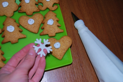 Далее выкладываем на тарелочку наши печеньки, взбиваем сливки (кондитерский крем) и с помощью кондитерского мешка делаем некое крепление для снежинки и малинки. Посыпаем сахарной пудрой.