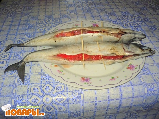Рыбу наобходимо очистить от внутренностей, нарезать полукольцами лимон и помидор. Очищенную рыбу хорошо заправить солью и перцем, нафаршировать ее дольками лимона и помидора и сверху взбрызнуть соком лимона. Для того что бы фарш из помидор держался в рыбе, заколите брюшко рыбы зубочистками.