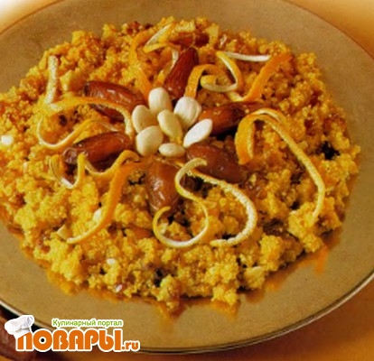 Если необходимо, слейте кускус и добавьте его в фруктовую смесь, тщательно размешайте и выложите на сервировочное блюдо.