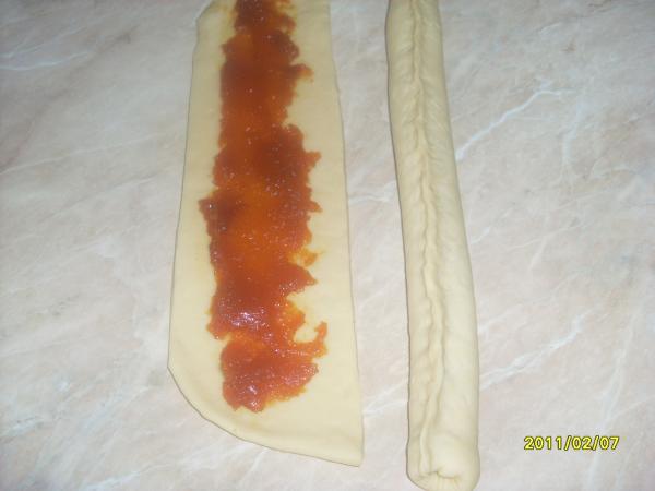 На середину каждой полоски положить повидло и защипать сверху - получится длинная "колбаска" с начинкой.