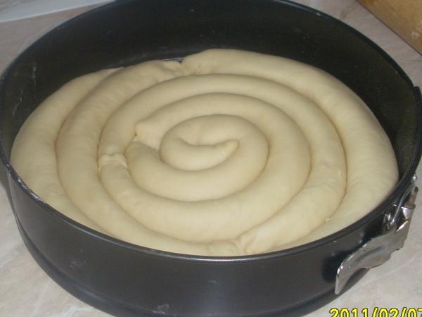 Первую "колбаску" свернуть в виде спирали, защипами внутрь и выложить в центр формы, смазанной маслом.