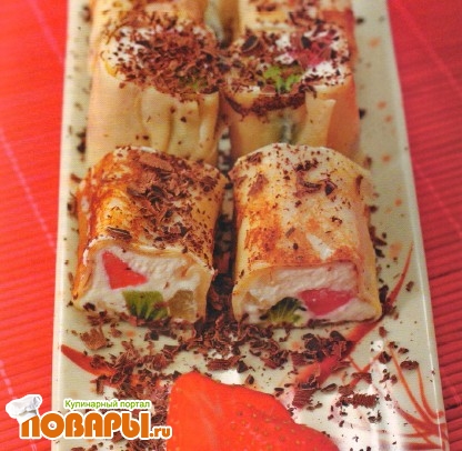 Творожную массу ровным слоем нанести на блин. В центр уложить кусочки фруктов, свернуть рулетом. Таким образом сделать 4 рулета и убрать их в холодильник на 1-1,5 часа.